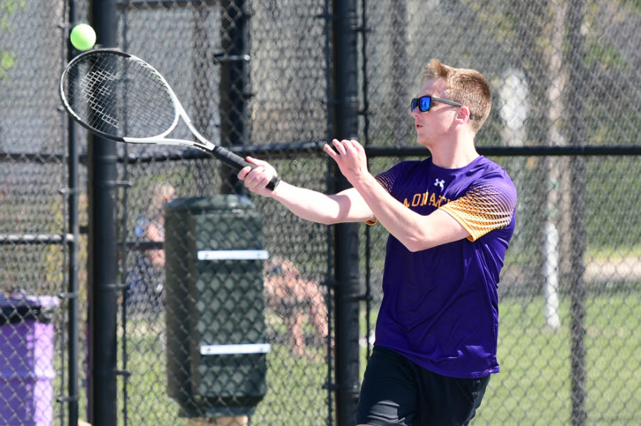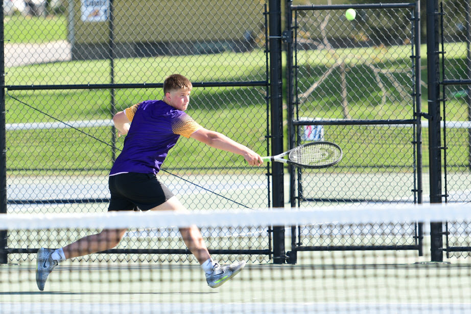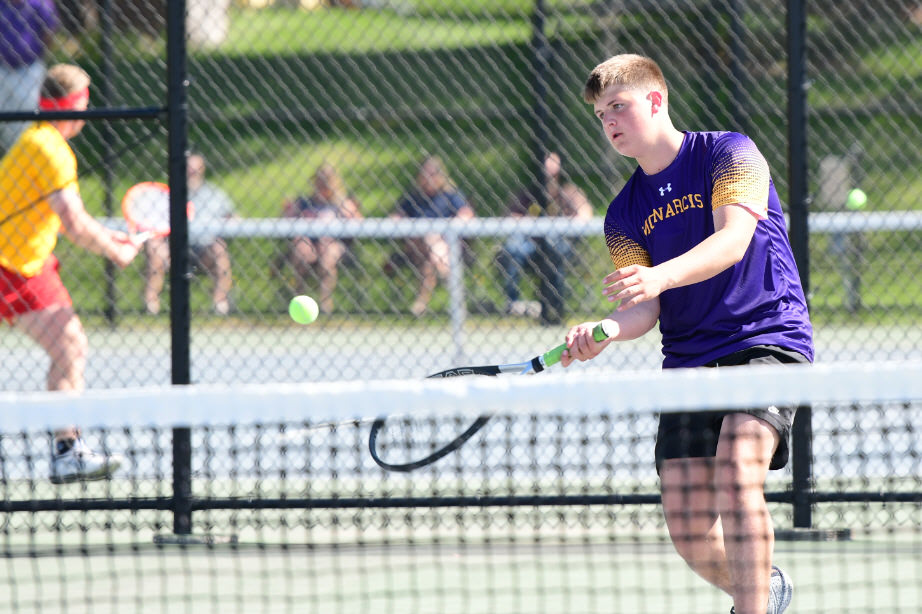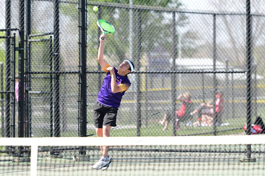 Jayden Bradley fired off a serve to his Kuemper opponent.